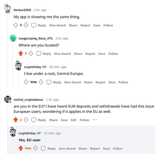 Tough nuts for European crypto investors, I guess, because we’re apparently back in “maintenance mode”.