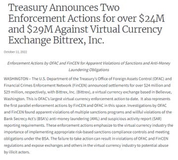 OCTOBER 11th, 2022 // Bittrex is fined $53 million (five $10 million mansions) for violations of trade sanctions and failure to comply with Anti-Money Laundering regulations.
