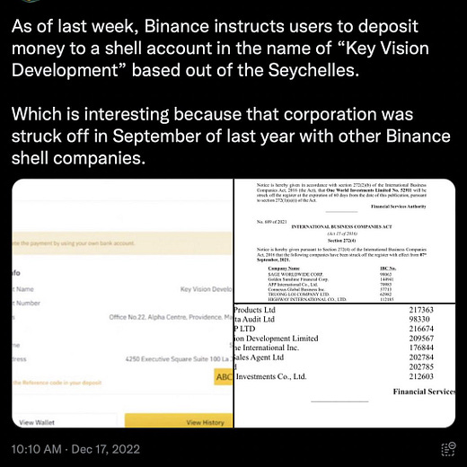 Given that The Cryptocalypse Chronicles recently assembled a very long and detailed timeline of the ebb and flow of the relationships between FTX, Sam Bankman-Fried, Changpeng Zhao, Binance, TrueUSD, Silvergate, and Signature we were not exactly surprised by this news. Still it was nice to see confirmation in the form of a Seychelles based company called “Key Vision Development Limited”. Europeans with Binance accounts who want to deposit USD into their trading account are instructed by Binance to send money to Key Vision Development Limited’s account.